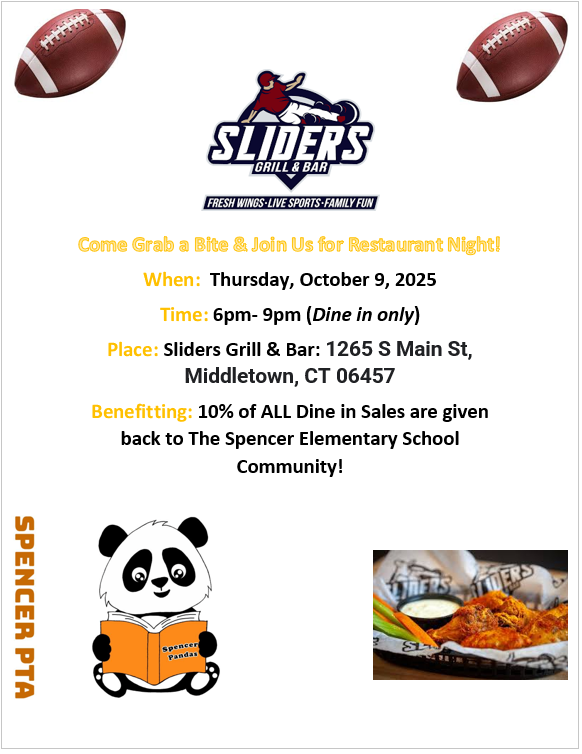 Posted: September 13, 2025 Filed under: Uncategorized Comments Off on Sliders Restaurant NIGHT!Come support Sliders in Middletown. 10% of the sales goes to future PTA events.