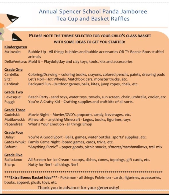Thank you to everyone for the generous donations that have been submitted already for next Friday’s basket raffles! Items for McInvale’s Kindergarten class and 3rd Grade Matikowski (Minecraft) have been fulfilled. If you are still interested in donating please feel free to select from any of the other categories. Donations can be left in the school’s Main Office or with your classroom teacher. We are asking that you please try to bring in the donations by this Friday 5/12, so that we can prepare in advance.